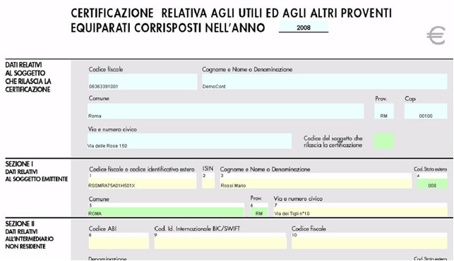 Nel modello CUPE“Certificazione relativa agli utili ed agli altri proventi equiparati corrisposti nell’anno” la procedura riporta in automatico i “Dati relativi al soggetto che rilascia la certificazione” , nelle altre sezioni inserire direttamente i dati nei campi.