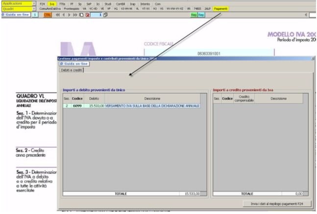 Nell’ applicazione è presenta la GESTIONE DEI PAGAMENTI DELL’IMPOSTA. In questa maschera vengono visualizzati tutti gli importi a DEBITO e a CREDITO che derivano dalla dichiarazione nella quale si sta lavorando.