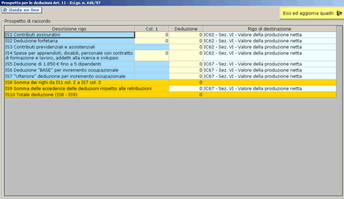 Gestione delle Deduzioni art.11 d.lgs. n.446/97. Tale prospetto, agganciato al quadro IS, può essere compilato sia nel quadro IC che nel quadro IS e in entrambi i quadri i dati saranno sempre aggiornati e in linea.