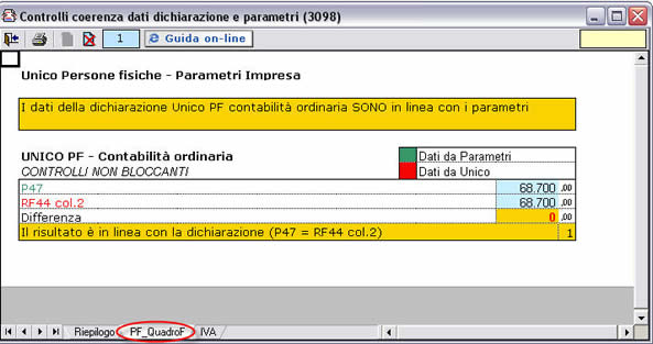 Dopo aver effettuato la compilazione del quadro è possibile verificare la correttezza dei dati indicati nel quadro “Parametri Impresa” con quelli indicati nel quadro dell’Unico in cui vengono indicati i redditi d’impresa (Quadro F – Redditi d’impresa in contabilità ordinaria e Quadro G – Redditi d’impresa in contabilità semplificata) e con la dichiarazione Iva, aprendo la gestione dal pulsante :