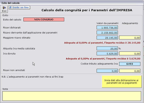 Il tasto riporta i dati relativi al risultato del calcolo della congruità effettuato nel programma fornito dall’Agenzia delle Entrate. Deve essere indicato l’importo dell’adeguamento parametri ai fini Irpef/Ires da riportare in dichiarazione e in “Parametri” e l’importo dell’iva da versare, da riportare nella gestione dei pagamenti.