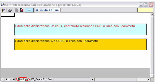 Nella gestione documenti che si apre c’è un primo foglio di riepilogo che indica se i dati indicati nel quadro Parametri Impresa sono in linea con i dati indicati in Unico e nella dichiarazione Iva:
