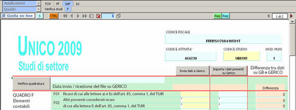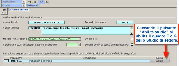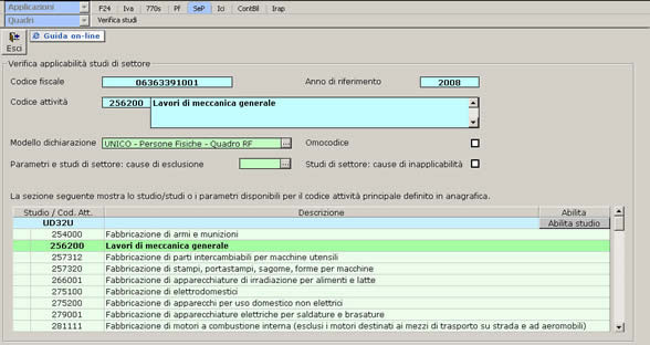 La procedura propone in automatico il codice fiscale della ditta, il codice attività, il modello di dichiarazione con relativo quadro abilitato. In base al codice attività verifica se per la ditta si applicano gli Studi di settore o i Parametri.