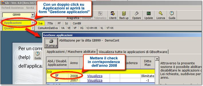 2) fare doppio click sul pulsante “Applicazioni”. Si aprirà la form che prevede l’elenco di tutte le applicazioni disponibili. Posizionarsi sull'applicazione “IVA”. Scorrere nell’elenco delle applicazioni e su “Iva” ceccare in corrispondenza dell’anno 2008.