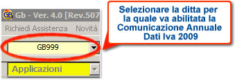 1) dalla casella a discesa, selezionare la ditta interessata per la quale va abilitata l’applicazione “Comunicazione Annuale Dati Iva 2009”.