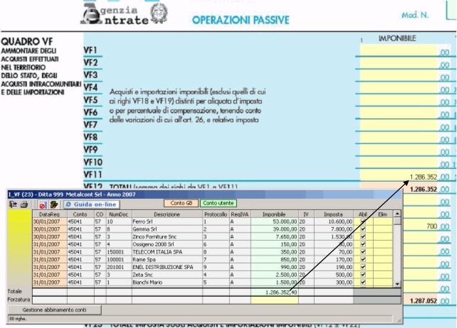 Il quadro VF "Ammontare degli aquisti effettuati nello stato, intracomunitari e importazioni" può essere compilato in due modalità differenti. In presenza del software integrato i dati provengono direttamente dalla contabilità, facendo doppio click nel campo si apre la scheda che mostra il dettaglio dei dati.