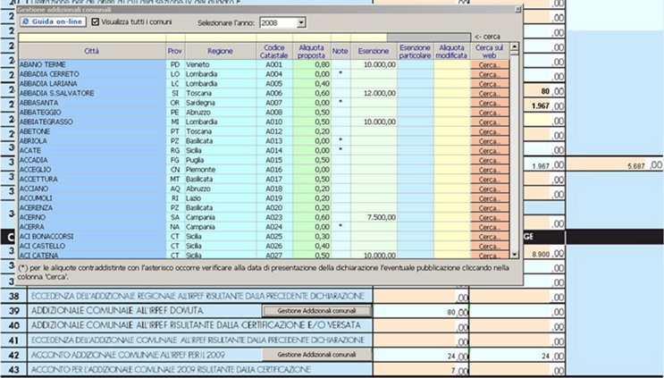 al rigo 39 dal pulsante “Gestione addizionali comunali” si apre la relativa gestione con le aliquote per la determinazione dell’addizionale comunale dovuto e l’acconto per l’anno successivo.