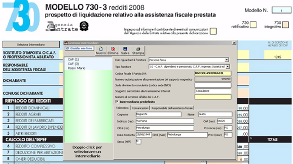 Per la compilazione della sezione " Selezione del sostituto d'imposta o CAF o professionista abilitato " si deve utilizzare la gestione intermediari che si apre dal pulsante Nella gestione devono essere inseriti gli intermediari con tutti i dati che vengono richiesti all’interno della stessa.
