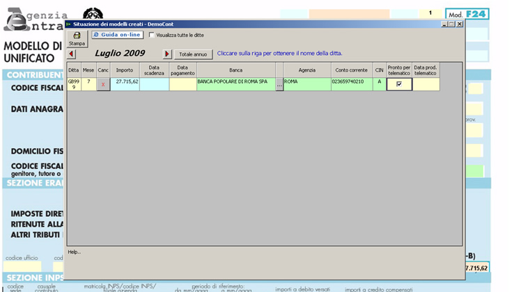 Dal pulsante “Riepilogo F24” viene evidenziata la situazione di tutti i modelli creati, con l’indicazione per ogni modello della ditta, il mese di creazione, il numero, l’importo e la data di scadenza.