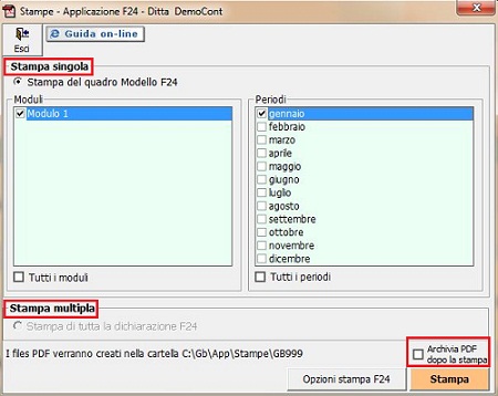 E' possibile inoltre effettuare l'archiviazione del file dopo la stampa ponendo il check in "Archivia PDF dopo la Stampa".