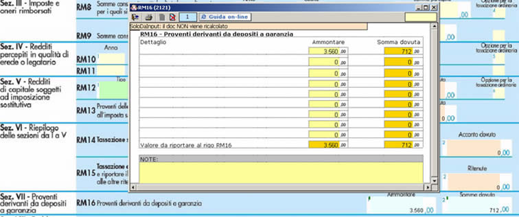 nella sezione VII “Proventi derivanti da depositi a garanzia” dove, inserendo l’ammontare dei proventi, la procedura calcola la somma dovuta;