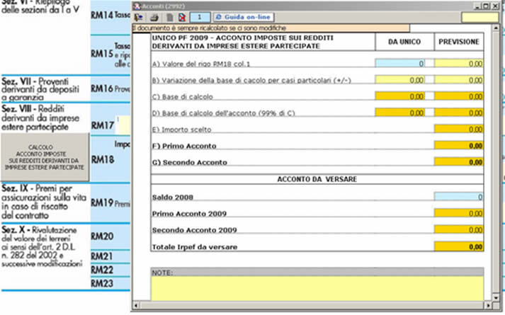 nella sezione VIII “Redditi derivanti da imprese estere partecipate” è presente la gestione per il calcolo dell’ ACCONTO delle imposte;