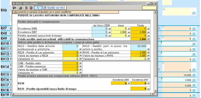 Nella parte centrale del prospetto la procedura effettua in automatico la compensazione delle perdite con il reddito del quadro RH,RE o CM. Eventuali eccedenze alla chiusura del prospetto vengono riportate nel quadro RS. Le perdite compensate vengono riportate nel quadro dove la perdita è stata scalata dal reddito.