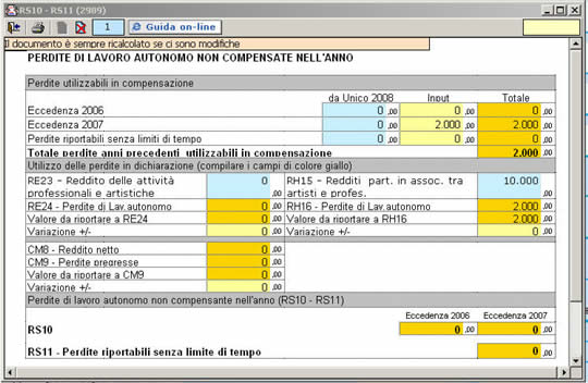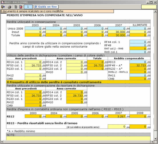 | Nel prospetto la procedura riporta in automatico le eccedenze di perdite non compensate negli anni precedenti da Unico 2008, se compilato con la nostra procedura, altrimenti i dati delle eccedenze devono essere inseriti nei campi di colore giallo.