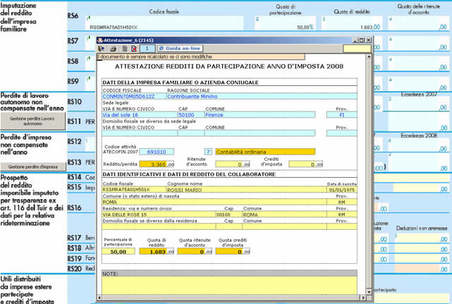 | Nell’attestazione devono essere inseriti i dati identificativi del collaboratore e la percentuale di partecipazione. La procedura determina in automatico la quota di reddito spettante, il prospetto può essere anche stampato.