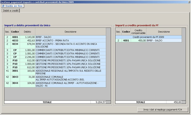 Dal pulsante INVIA I DATI AL RIEPILOGO PAGAMENTI F24 i DEBITI e CREDITI vengono inoltrati al RIEPILOGO pagamenti Dichiarazionipresente in F24. Tale gestione permette di effettuare le compensazioni, rateazioni e pagamenti dei tributi.