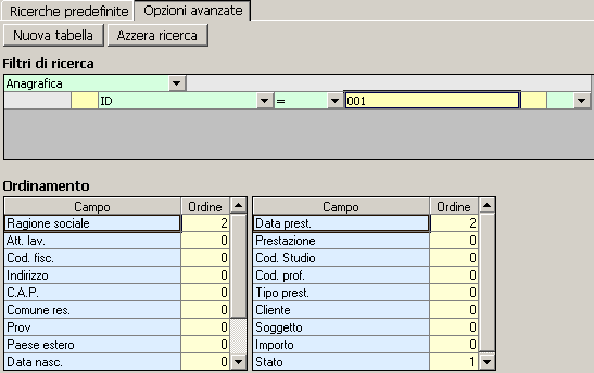 Nella parte inferiore della maschera è presente la sezione ordinamento che permette di ordinare una eventuale ricerca avanzata oppure una predefinita in base ai campi presenti.