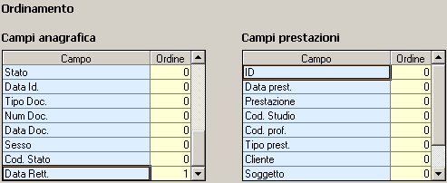 Ad esempio se si vuole ordinare in primis per data registrazione e successivamente per nome/ragione sociale, il campo ordine a fianco di Data Rett. dovrà essere valo rizzato con 1 mentre il campo Ragione sociale con 2.